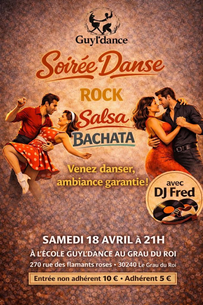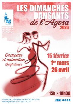 - Dimanche 26 avril : Les dimanches dansants de l’Agora avec orchestre et animation Guyl’dance de 15h à 18h30. Entrée : 10 euros (boissons inclus). Inscription au Palais des sports du Grau du Roi.